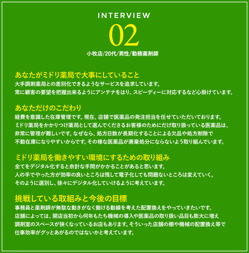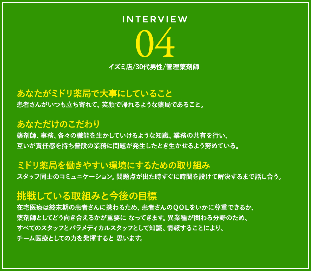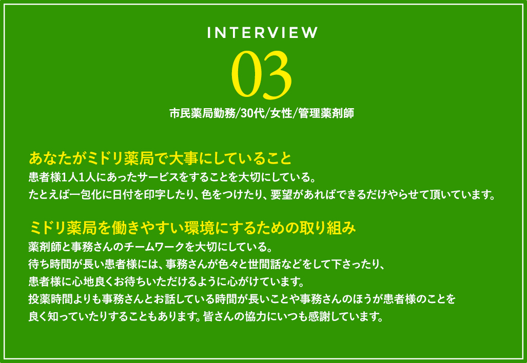 1人1人の意見が通りやすくて、アイディアを採用されやすいのがミドリ薬局。「薬のことは何でも聞ける。我が家はいつもミドリ薬局」